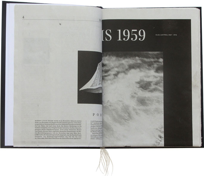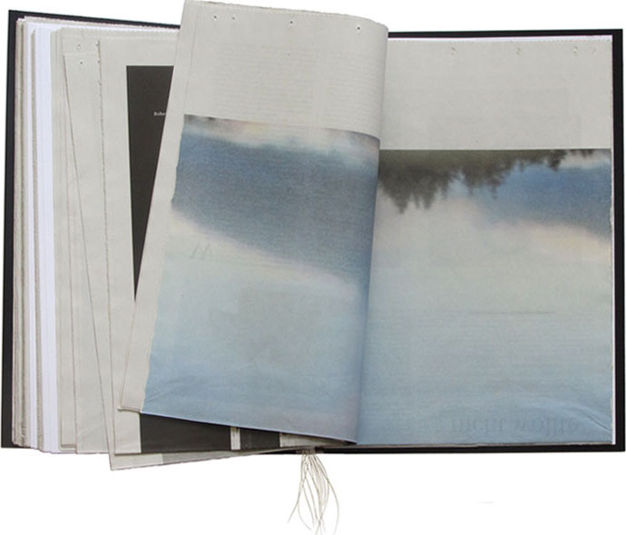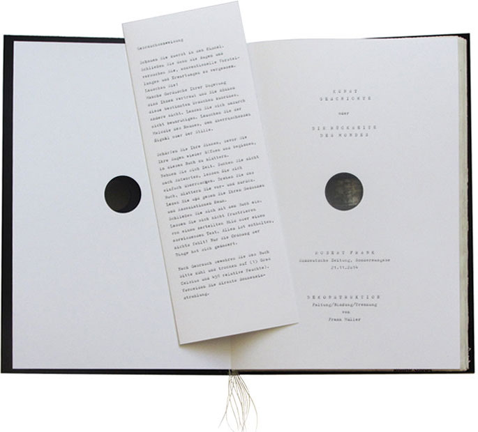 GESCHICHTE ODER DIE RÜCKSEITE DES MONDES Sonderausgabe der Süddeutschen Zeitung vom 21.11.2014 zu Robert Frank Dekonstruktion - Faltung/Bindung/Trennung Mit Texten, Sentenzen und einer originalen Faltung Schreibmaschinentyposkript 29,5cm x 20,5cm, ca. 270 Seiten, Fadenbindung, signiert Gebrauchsanweisung lose beiliegend Auflage 9 Stück, 2015 "Alles ist enthalten, nichts fehlt! Nur die Ordnung der Dinge hat sich geändert... Die Zeitung wurde von mir auf ein Viertel gefaltet und ... zum Buch gebunden. Dann habe ich mit einem Rasiermesser die Seiten aufgeschnitten." Das Künstlerbuch entstand als poetischer Kommentar zum Robert-Frank-Projekt der Süddeutschen Zeitung und der Münchner Akademie der Künste im November 2014. ![]() ![]() ![]() ![]() ![]() |