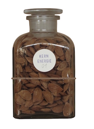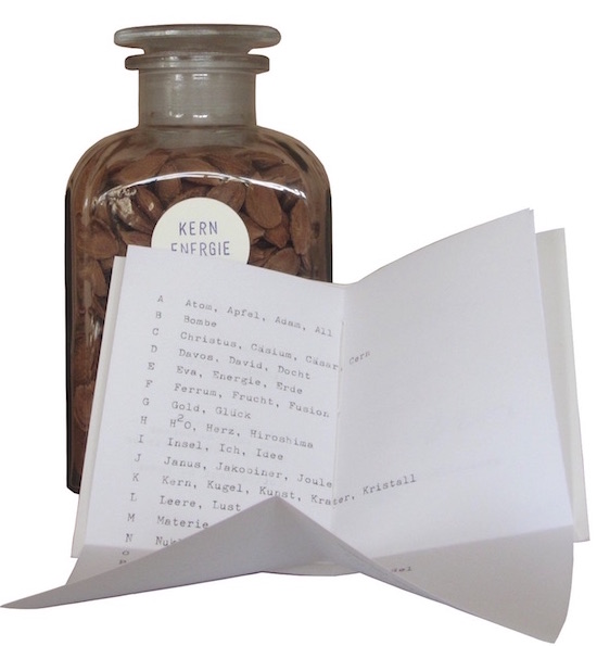 ENERGIE Objekt bestehend aus einem mit Pflaumenkernen gefüllten Apothekenglas und einem angebundenem Heftchen (11cm x 8cm) mit einem Gedicht (Kern-ABC) und Angaben zur Füllmenge und Herkunft der Kerne. Laut Anweisung soll das Gedicht laut gelesen werden. 15,5cm x 9,0cm x 7,0cm, Multiple, nummeriert, signiert ohne definierte Auflage, Rögling 2016 ![]() ![]() |